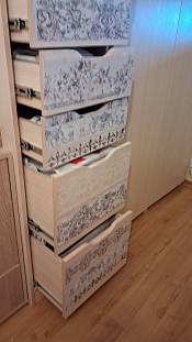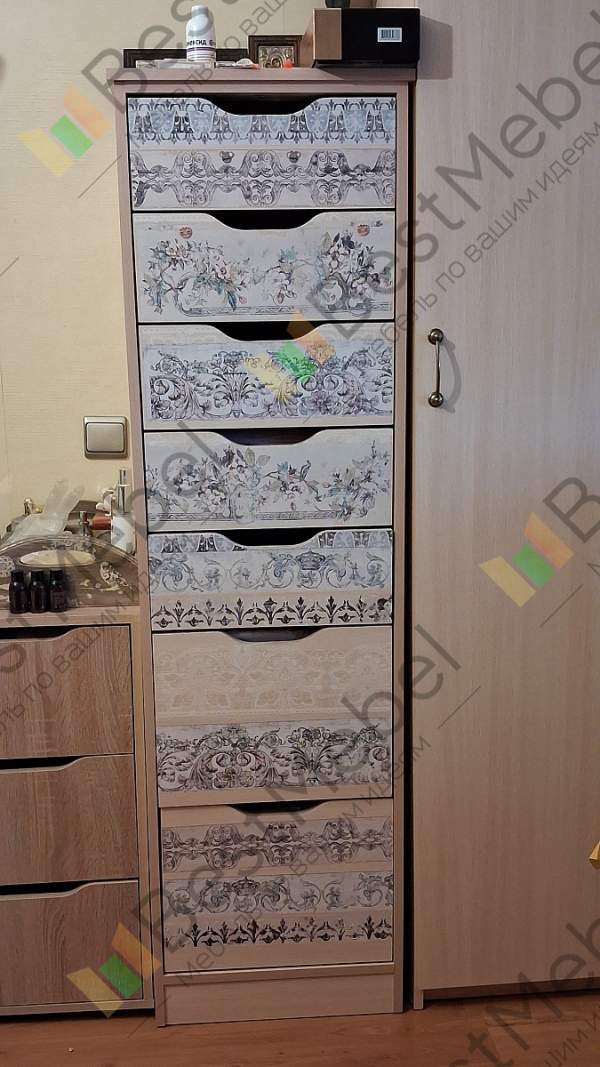 Комод заказала по своим размерам.Получилось как надо.Хотелось бы боковые полки выше.