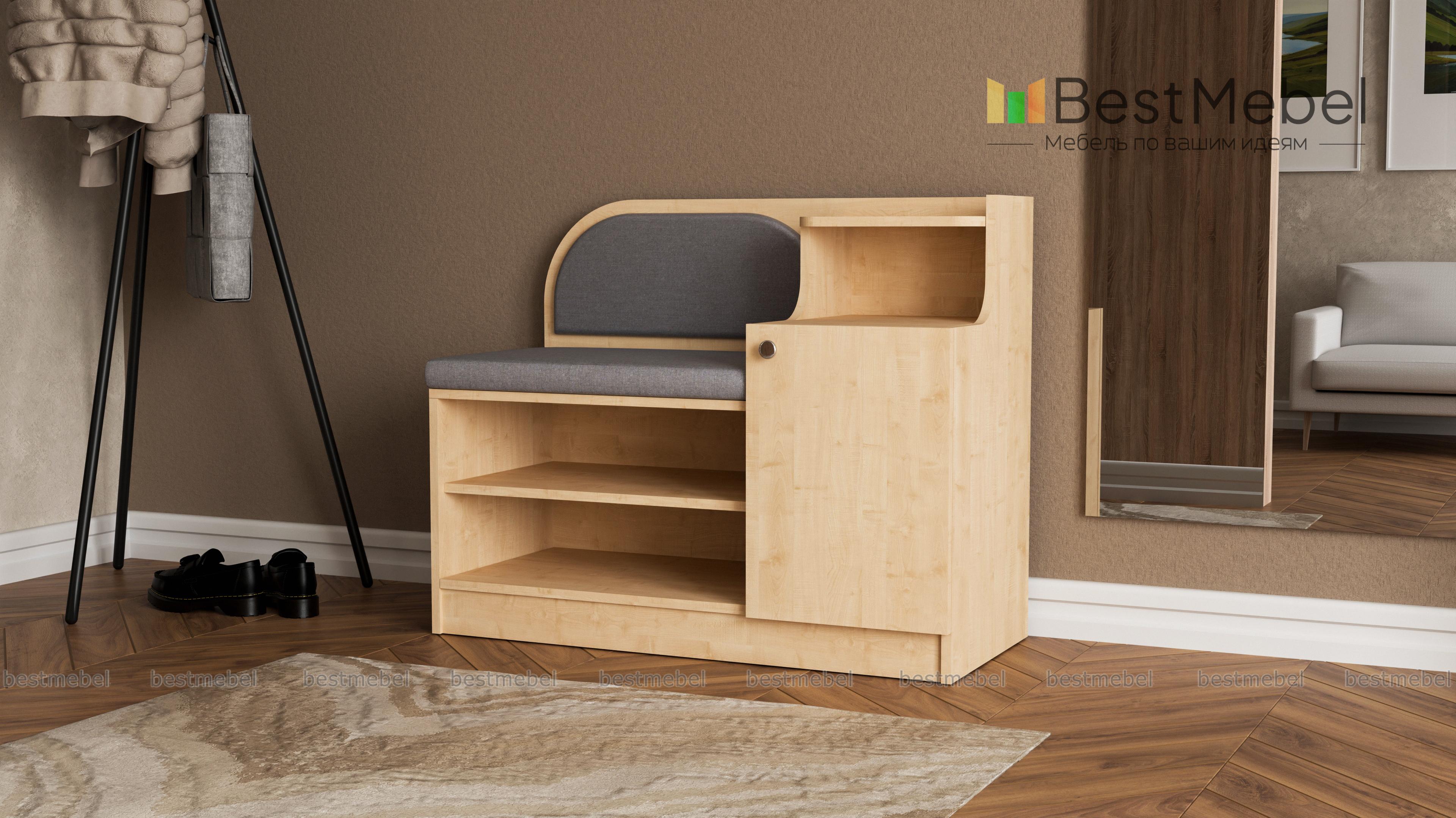 Обувница Меренга BMS поможет вам не только бережно разместить обувь, уходовые средства и бытовые мелочи, но и с комфортом обуться. Многофункциональная модель оборудована открытыми обувными полками, распашным отделением, нишей и сиденьем с высокой скругленной спинкой. Обувница выполнена в практичных темных тонах, на сиденье располагаются мягкие накладки в износостойкой ткани. Купить обувницу Меренга BMS и дополнить интерьер входной зоны практичным предметом вам поможет наш интернет-магазин.