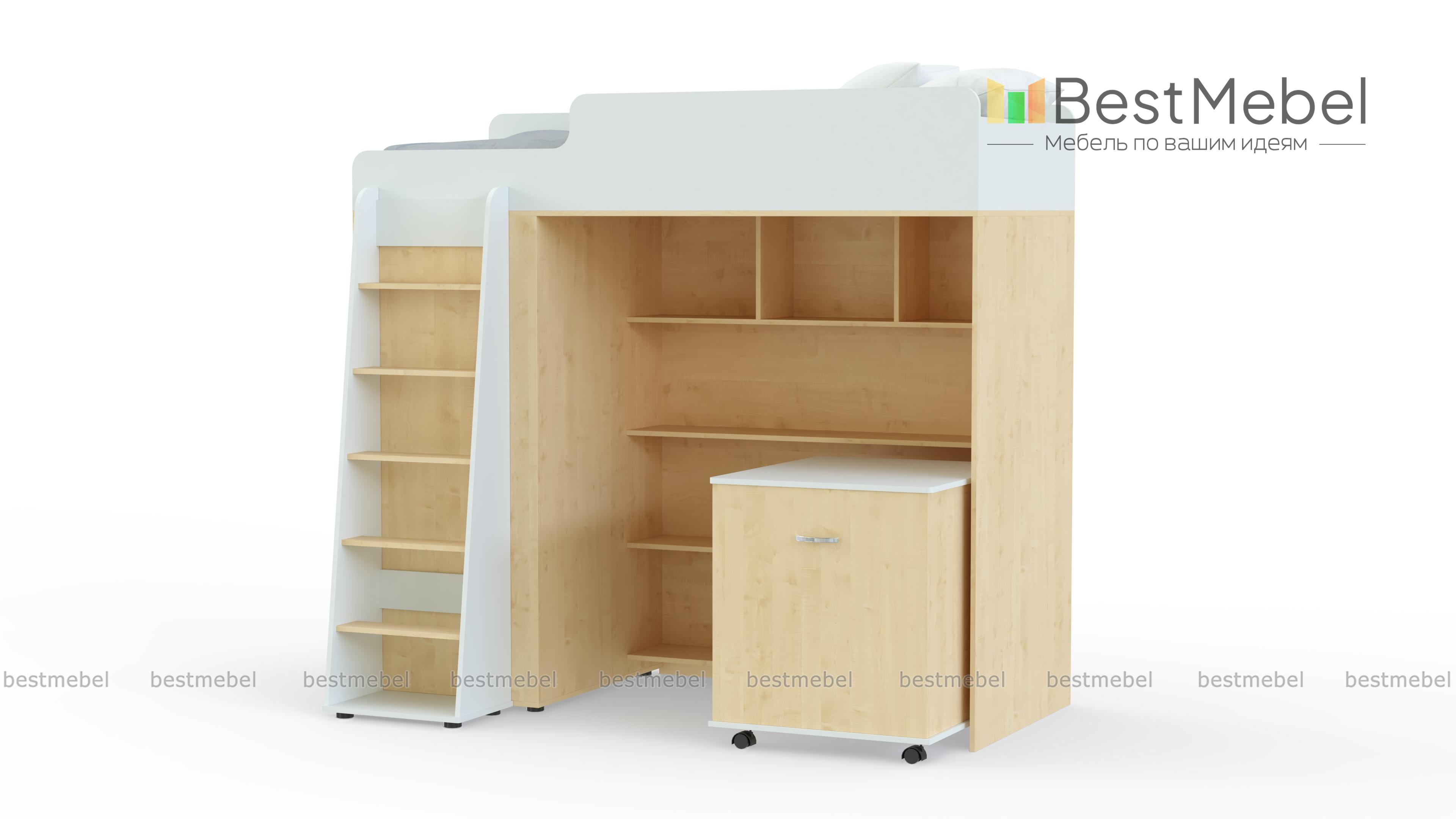 Кровать-чердак Миф-5 BMS представляет собой практичную модульную композицию, незаменимую в малогабаритных помещениях. Спальное место второго яруса оборудовано скругленными защитными бортиками и дополнено приставной устойчивой лестницей. В нише первого яруса располагаются открытые книжные полки и тумба, а с торца разместился шкаф для одежды. Выполненная в сочетании светлых древесных тонов и белых вставок, кровать гармонично дополнит интерьер детской и порадует ребенка. Купить кровать-чердак Миф-5 BMS приглашаем в наш интернет-магазин по отличной цене.