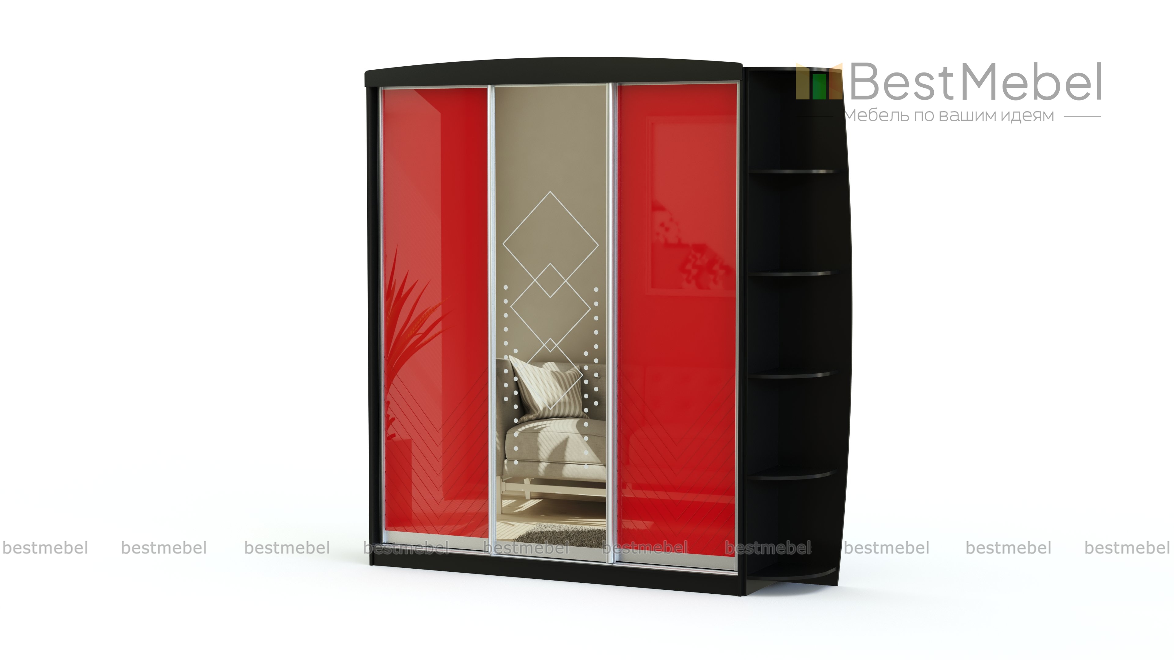Шкаф-купе Куб BMS с тремя створками и дополнительным открытым стеллажом с полками отлично впишется в просторную прихожую или небольшую квартиру-студию. Комбинированное оформление фасада шкафа позволяет гармонично вписать его в интерьер помещения, не утяжеляя его. Центральная створка по умолчанию декорируется цельным зеркалом с пескоструйным рисунком. Внутреннее наполнение шкафа может быть подобрано в индивидуальном порядке и включать выдвижные ящики, штанги для вешалок и полки.