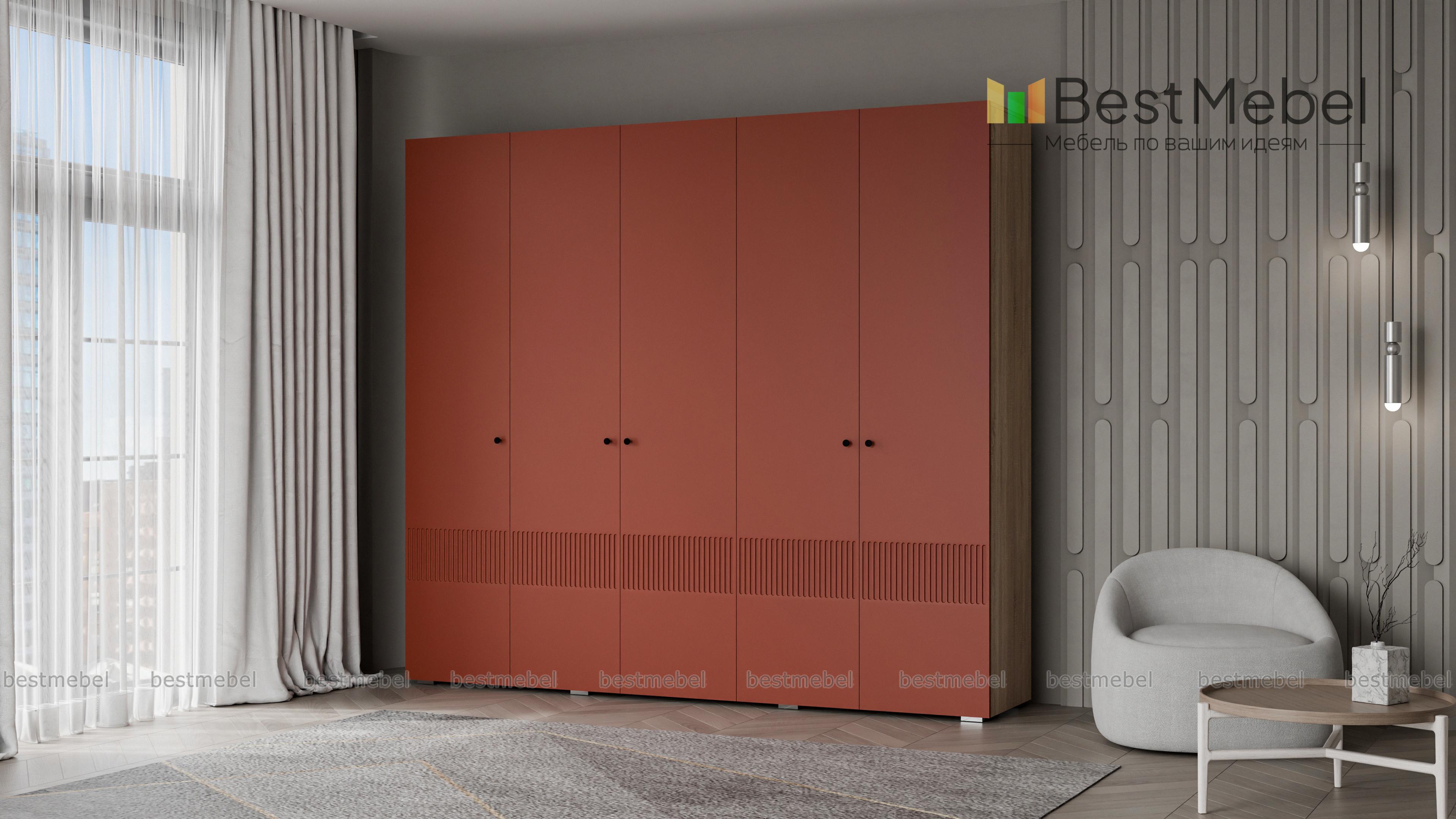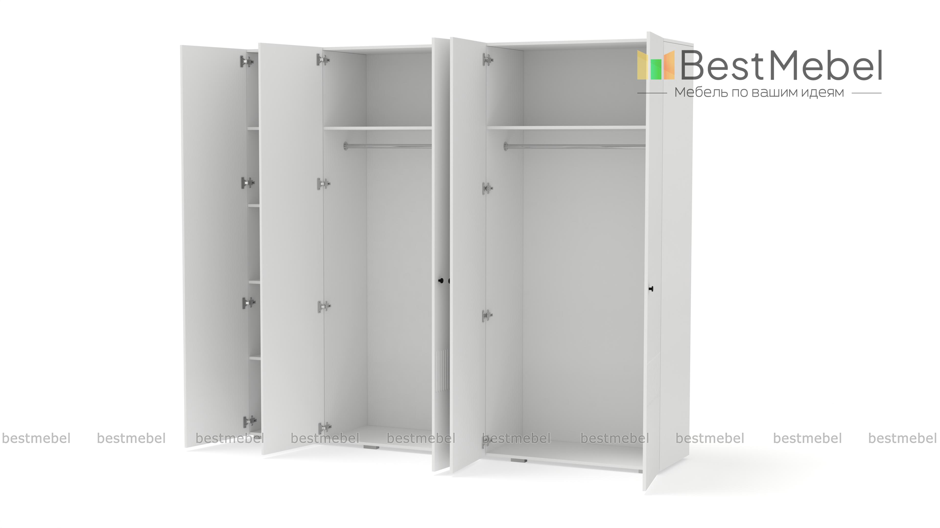 Шкаф распашной Джосс 5 BMS — это яркая современная модель с цветным фасадом и фрезеровкой. Комплектация с двумя штангами и полками подходит как для сложенной, так и развешанной на вешалках одежды, а также обуви и коробок с аксессуарами. С помощью этого пятидверного шкафа вы сможете удобно и эстетично организовать хранение гардероба для двух человек. Купить шкаф распашной Джосс 5 BMS с выбором размеров, цвета и фурнитуры приглашаем к нам в интернет-магазин.