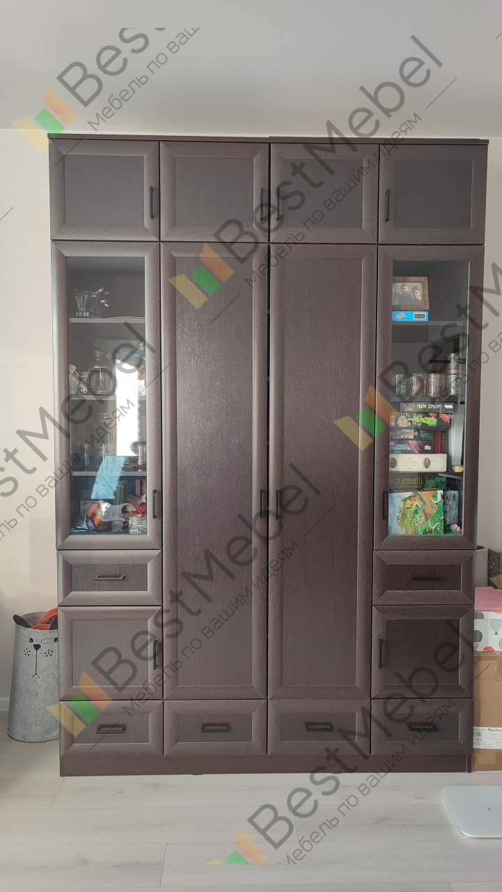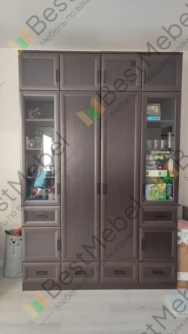 Шкаф распашной Фауст 4 BMS привлекает наличием разноплановых отделений, благодаря которым вы сможете компактно разместить одежду, книги, посуду, декоративные предметы и множество бытовых мелочей. Модель оборудована платяным двухдверным отделением, глухими секциями и витринами, выдвижными ящиками и просторной антресолью. Рамочные фасады с ручками-рейлингами выглядят элегантно в контрастных древесных тонах. Купить шкаф распашной Фауст 4 BMS для меблировки гостиной приглашаем в наш интернет-магазин.