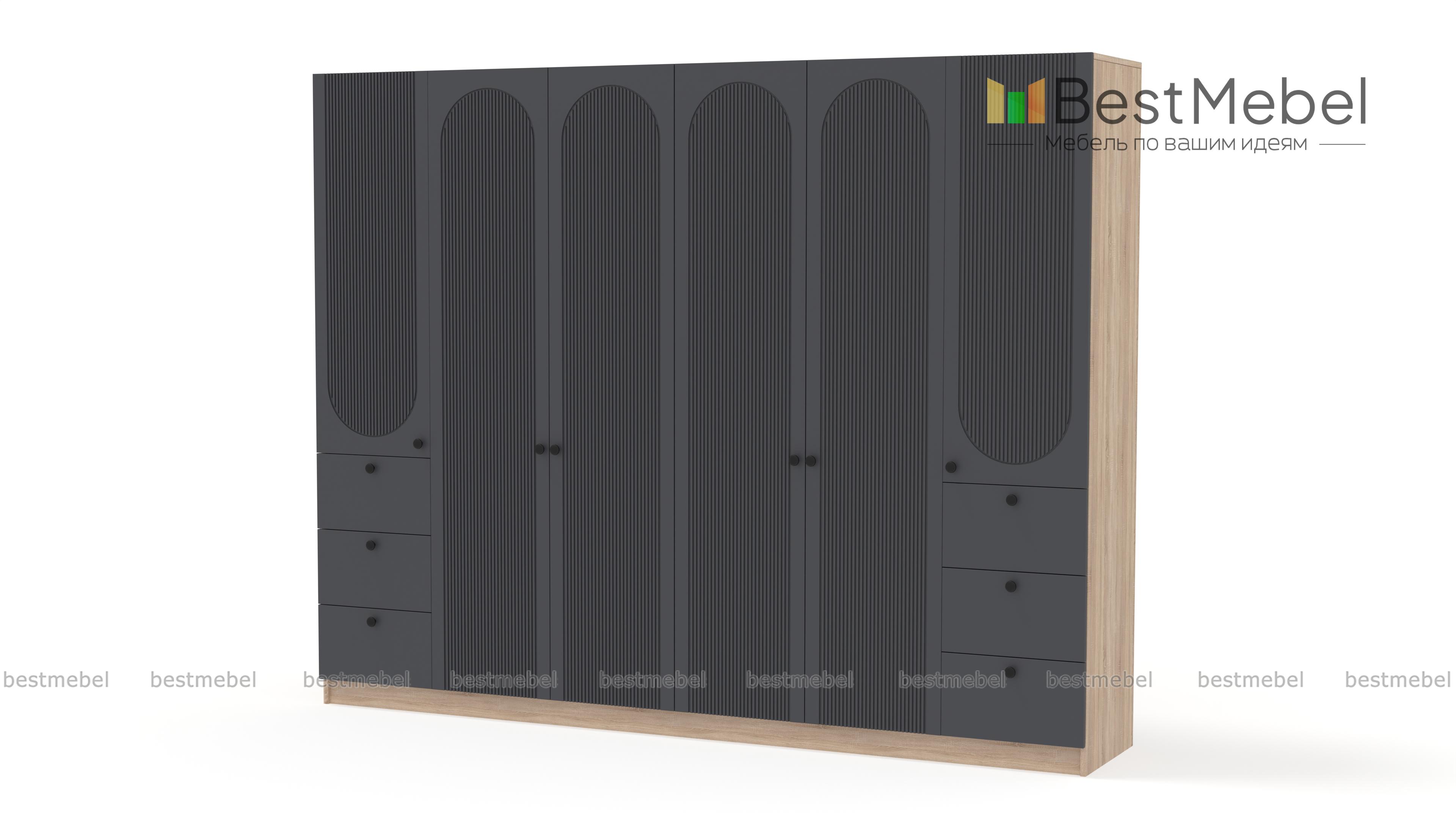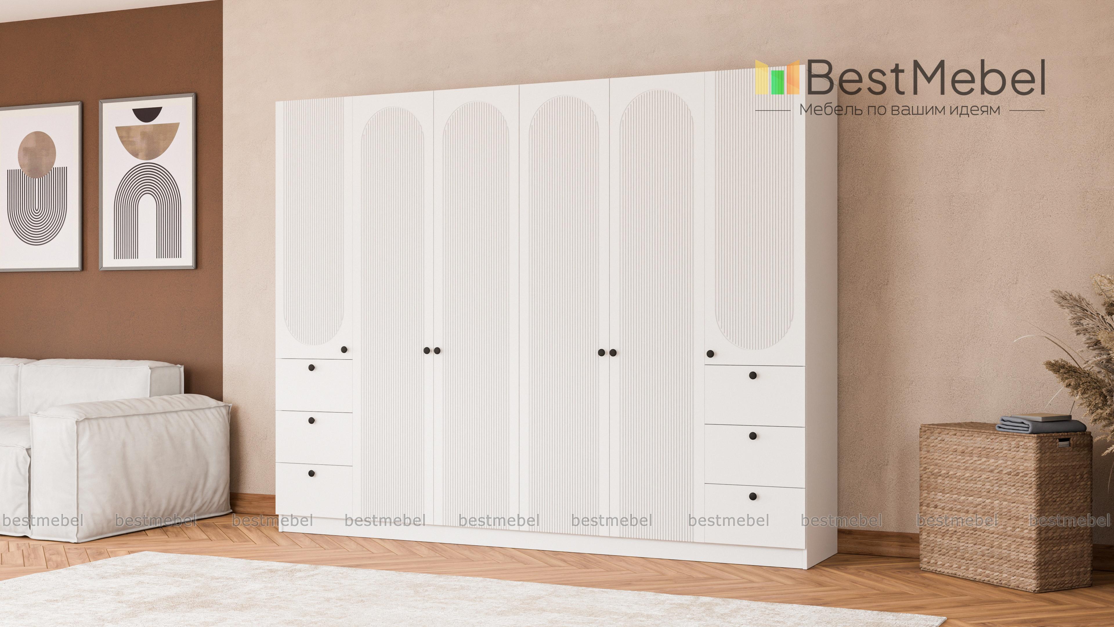 Шкаф распашной Рене 33 BMS объединил два платяных отделения в центре и две расположенные по бокам однодверные секции с ящиками. Большое количество мест для хранения позволяет компактно разместить гардероб, мелкие аксессуары и постельные принадлежности. Фасад шкафа украшен геометричным рельефом, на дверцы и ящики установлены удобные круглые ручки. Купить шкаф распашной Рене 33 BMS, изготовленный по индивидуальным размерам, вы сможете на сайте нашего интернет-магазина.