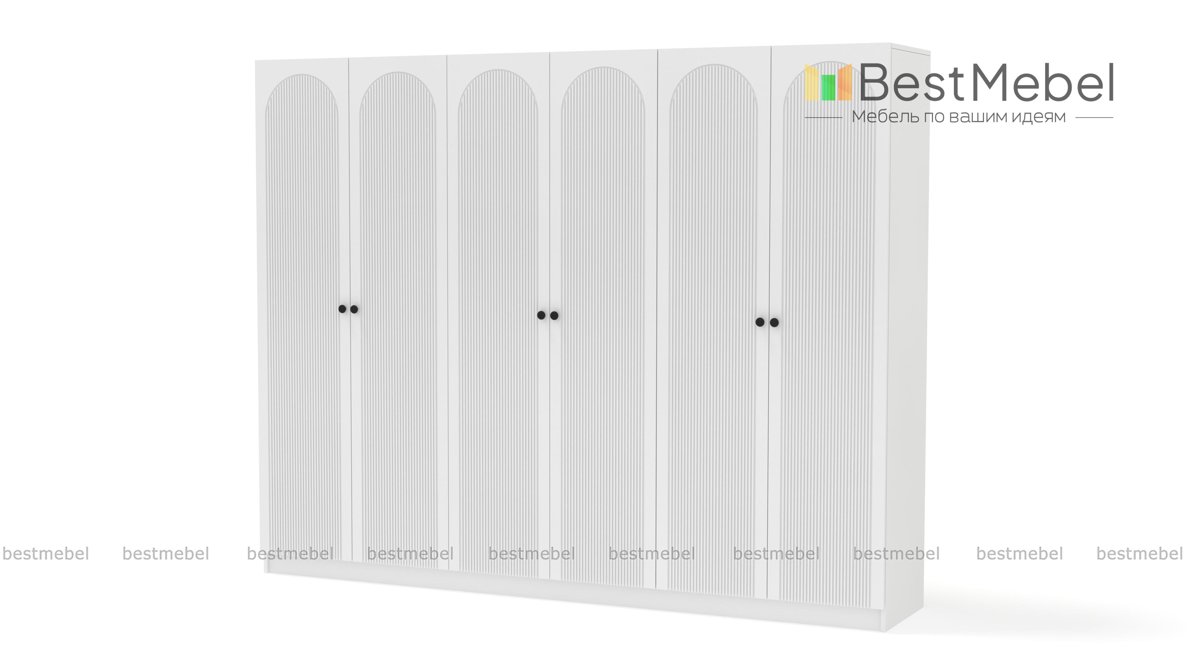 Шкаф распашной Рене 35 BMS — это отличная вместительность трех платяных отделений и современная эстетика. Фасад шестидверной модели с арочным декором и фрезеровкой красиво сочетается с корпусом в древесных тонах. Качественные материалы — ламинированная плита и МДФ, и надежная фурнитура делают пользование комфортным и долговечным. Купить шкаф распашной Рене 35 BMS вы сможете на сайте нашего интернет-магазина с изготовлением по индивидуальным размерам.