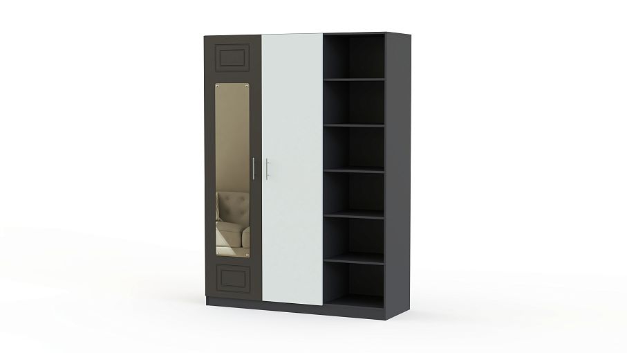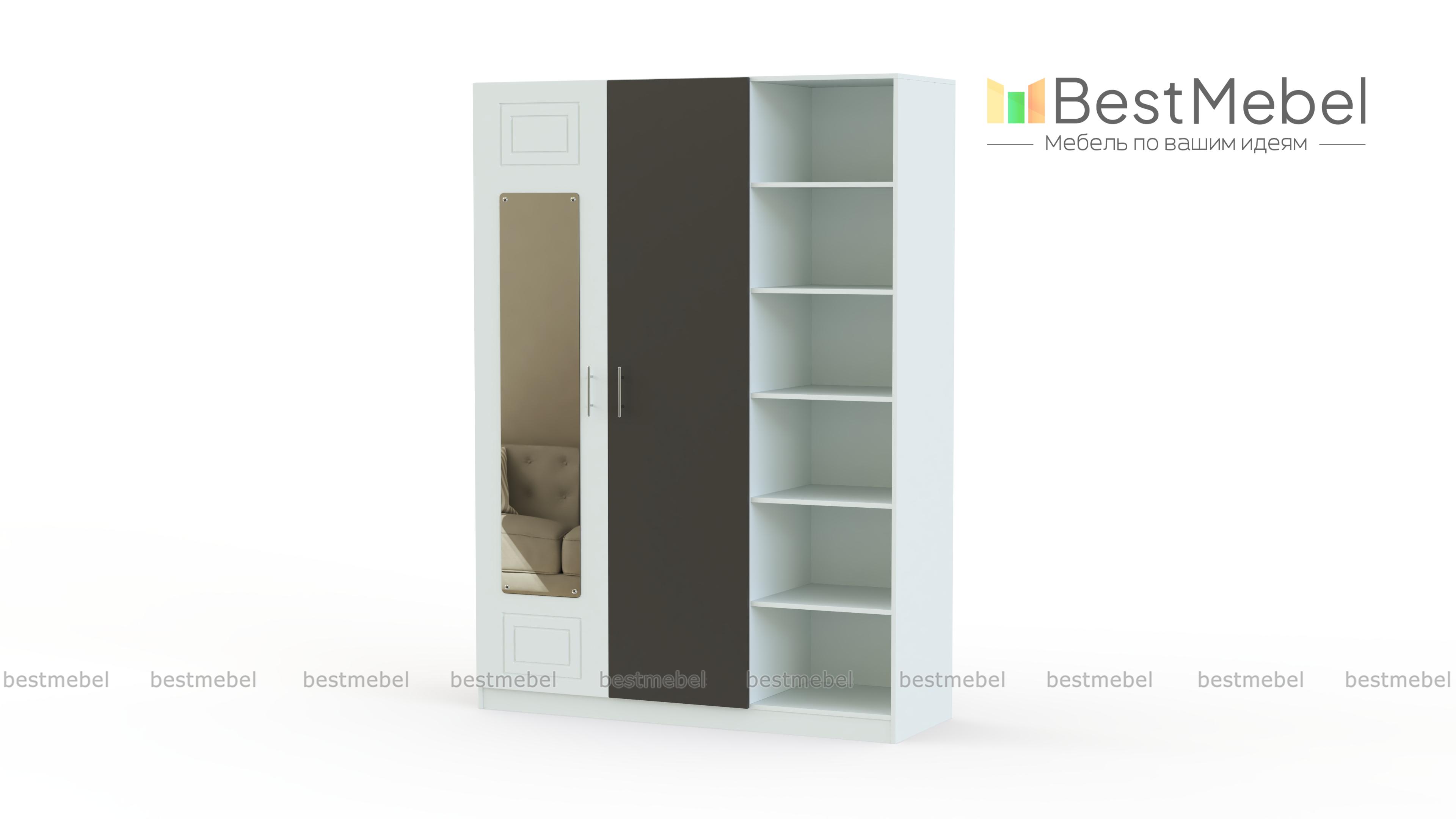 Шкаф с зеркалом Анастасия 4 BMS отличается особенной вместительностью благодаря комбинированной конструкции и элегантным современным дизайном. Двухдверное платяное отделение со штангой дополнено стеллажом с открытыми полками для необходимых в зоне быстрого доступа вещей. Фрезерованные фасады выполнены в контрастных тонах, одна из створок оборудована незаменимым для примерок ростовым зеркалом. Купить шкаф с зеркалом Анастасия 4 BMS для комфортного спального интерьера приглашаем в наш интернет-магазин.