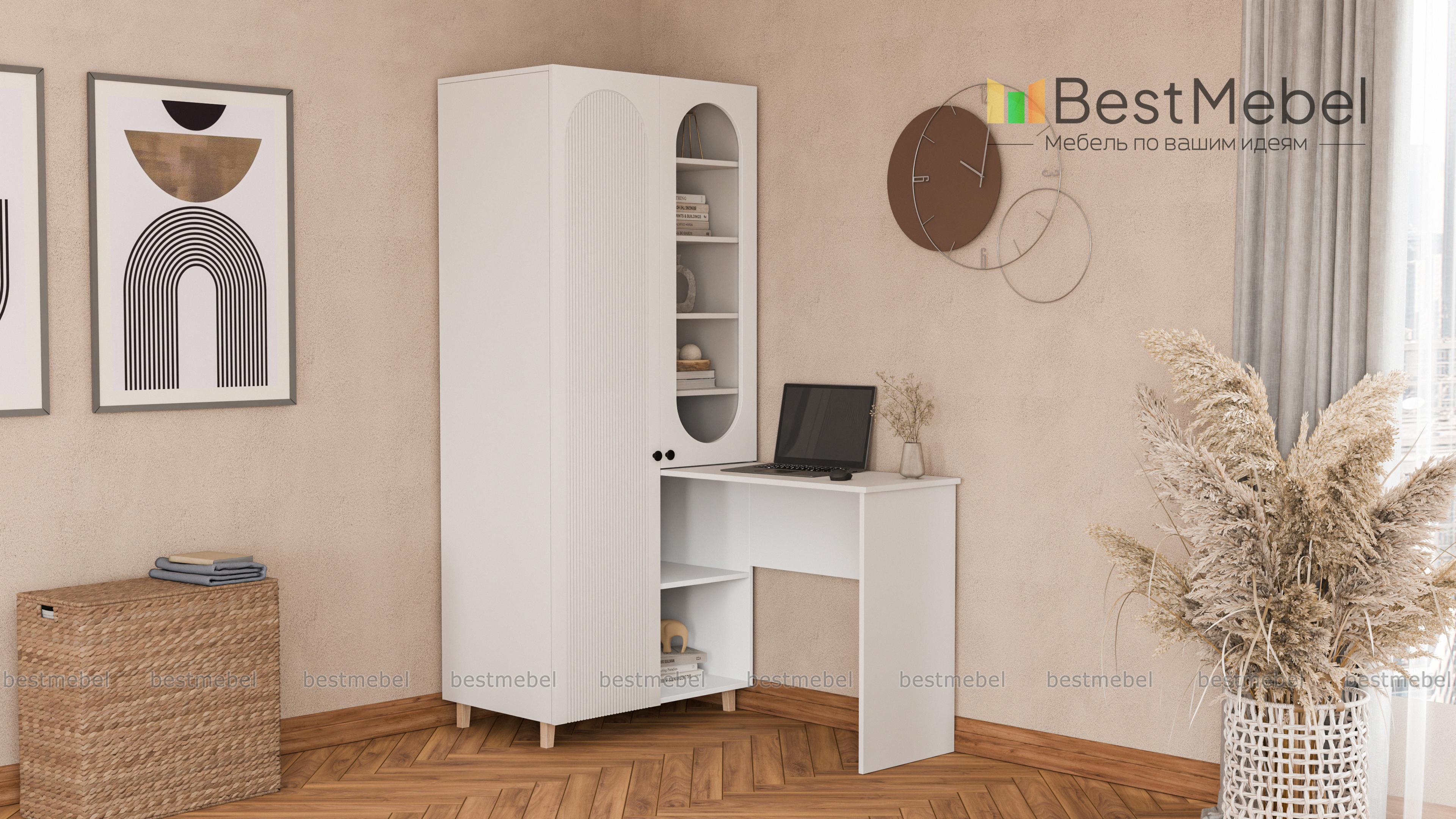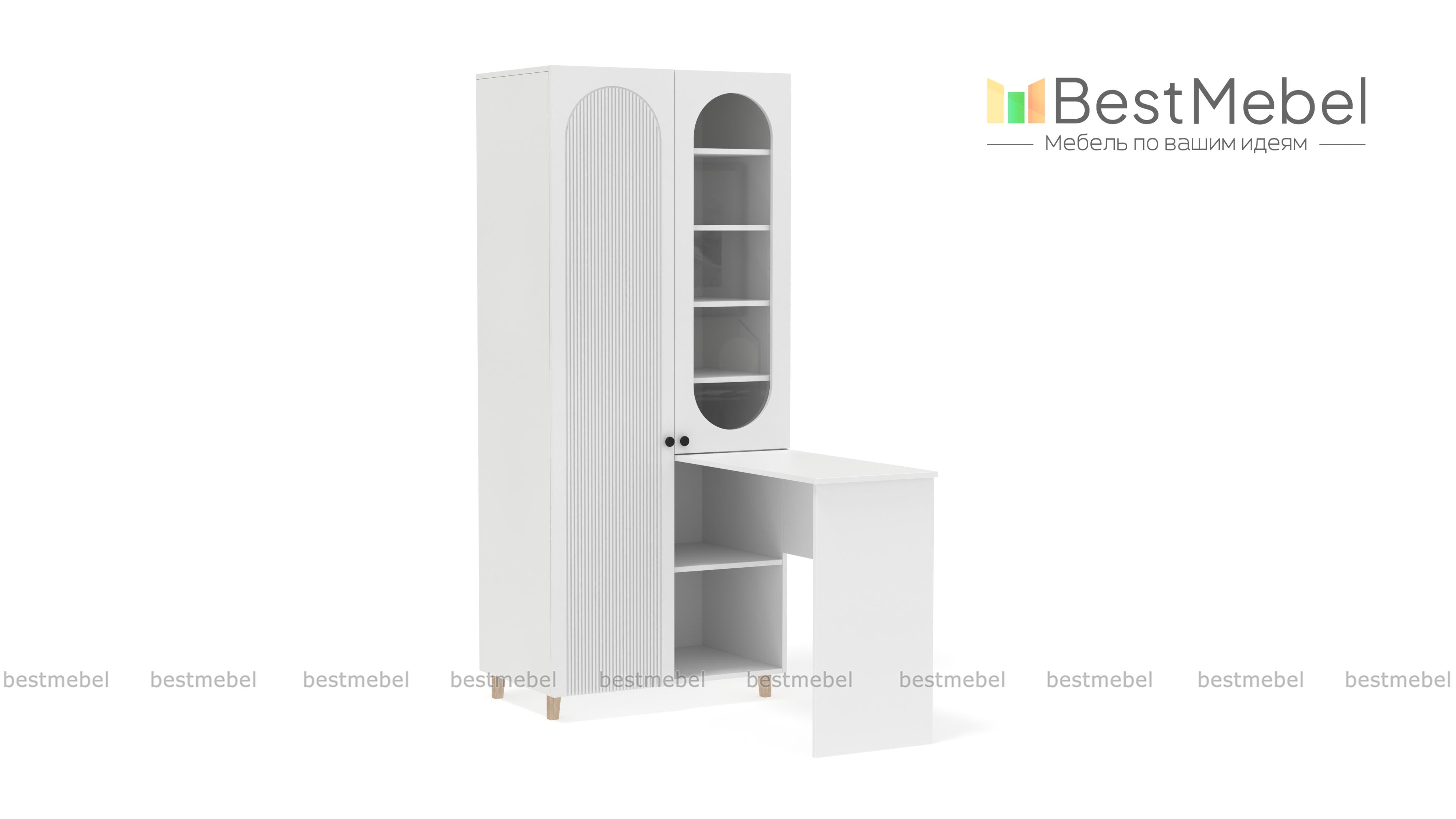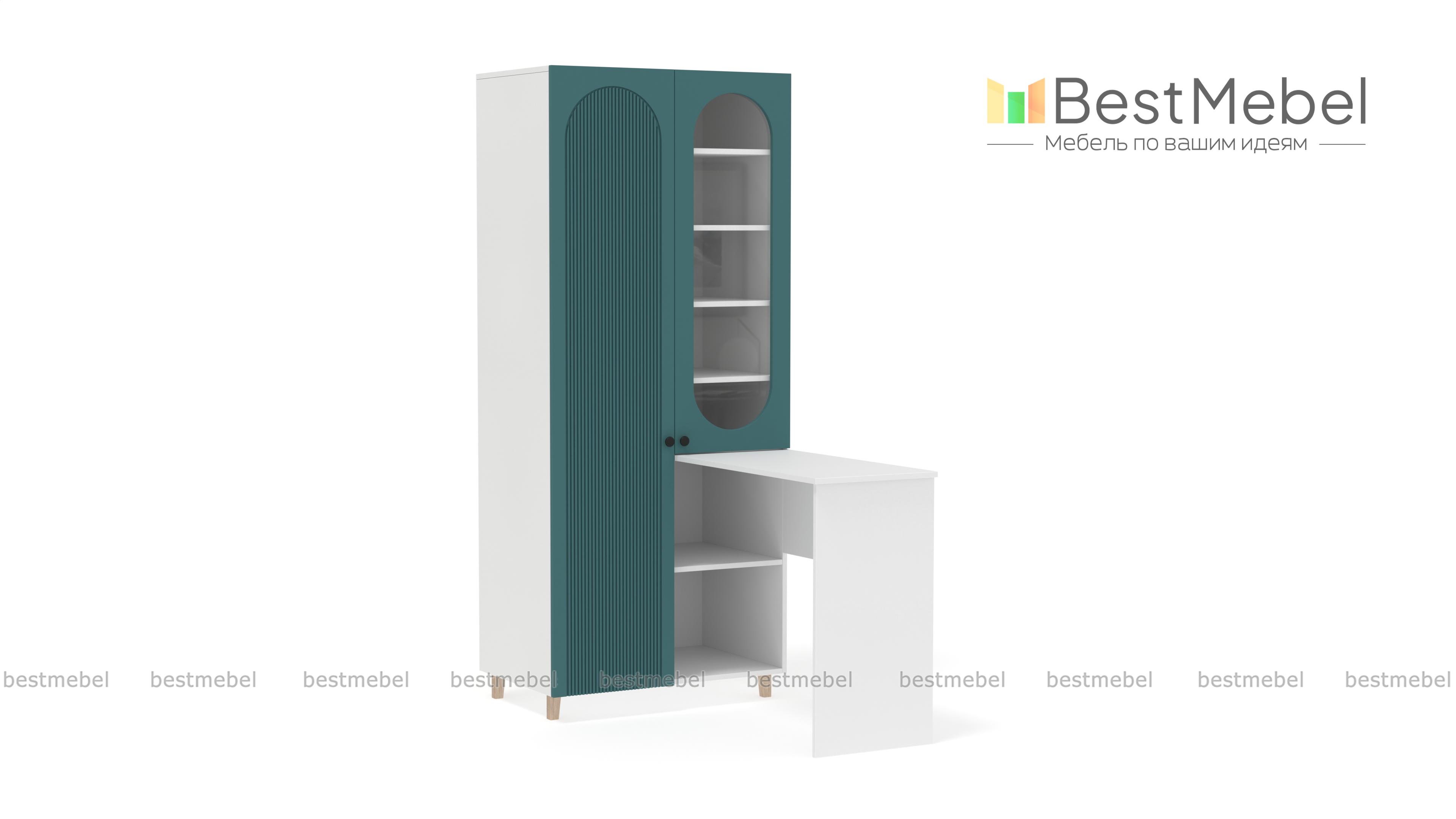 Шкаф со столом Рене 4 BMS — это многофункциональная современная мебель для детской комнаты или гостиной. Угловая композиция включает в себя распашной шкаф, оснащенный закрытым отделением для одежды, полками и витриной, и письменный стол. Стильные акценты в отделке — овальный вырез витрины и фрезеровка фасада, устойчивость и легкость дарят высокие ножки. Купить шкаф со столом Рене 4 BMS, изготовленный по вашим размерам, приглашаем на сайт нашего интернет-магазина.
