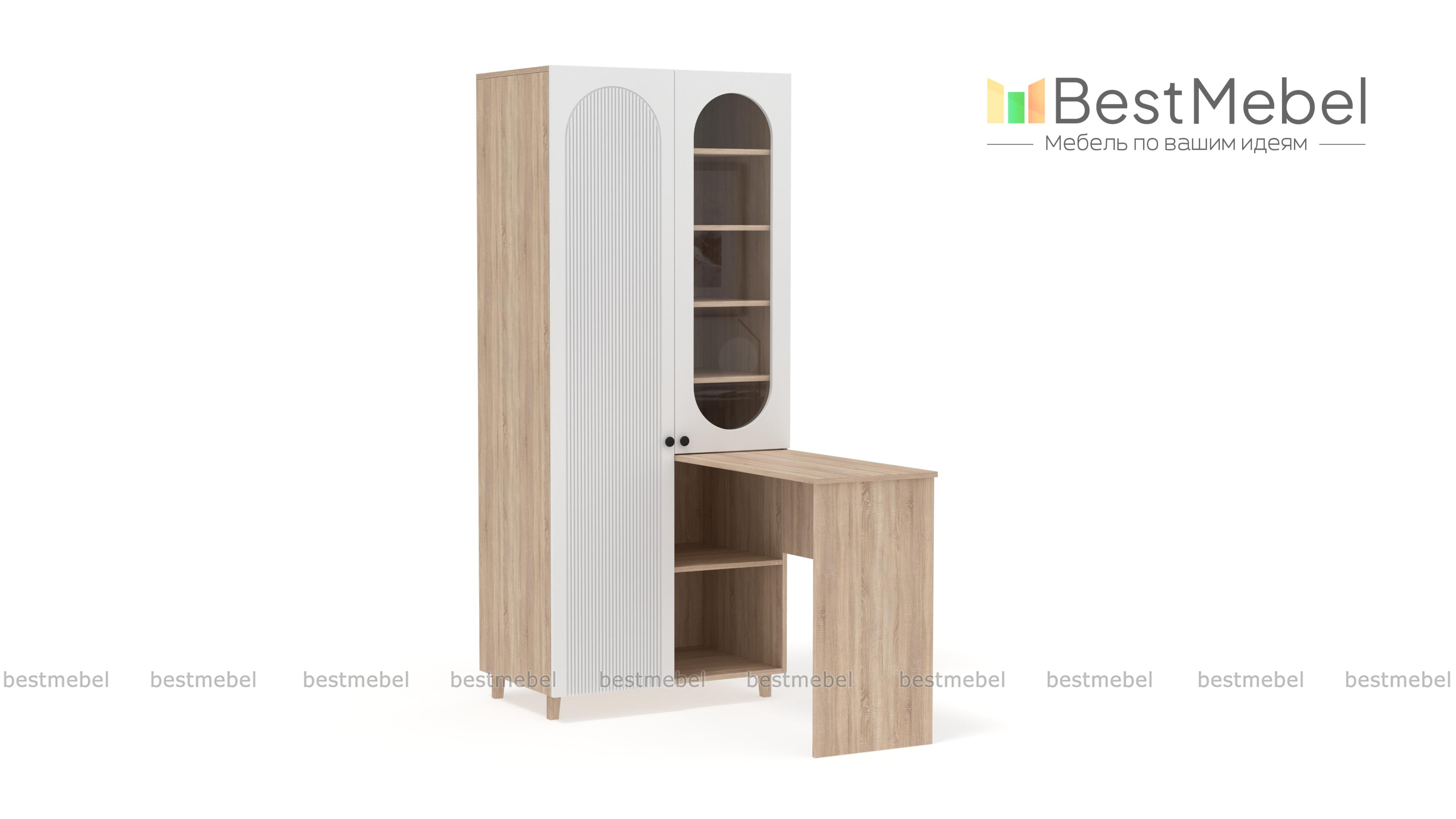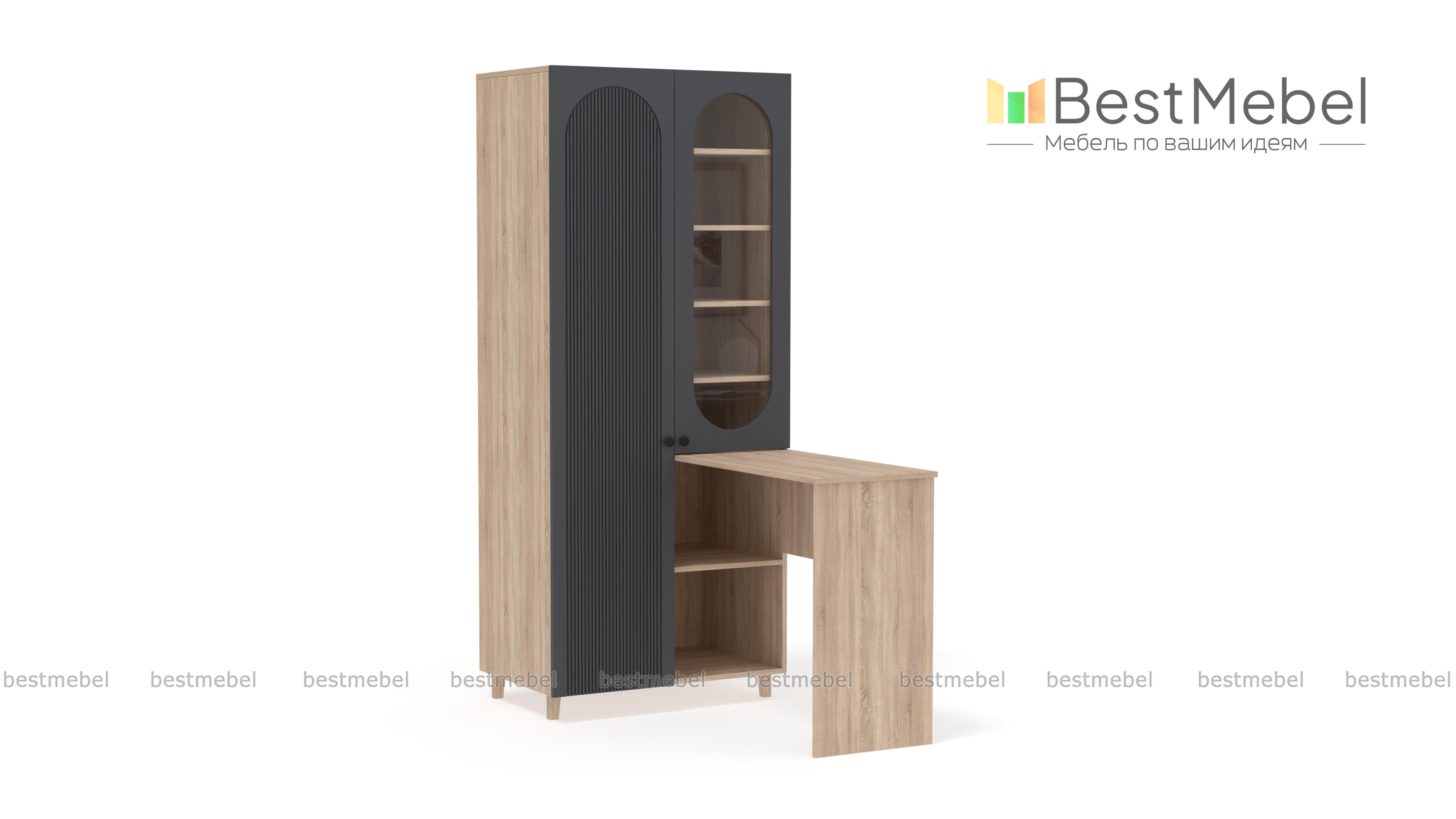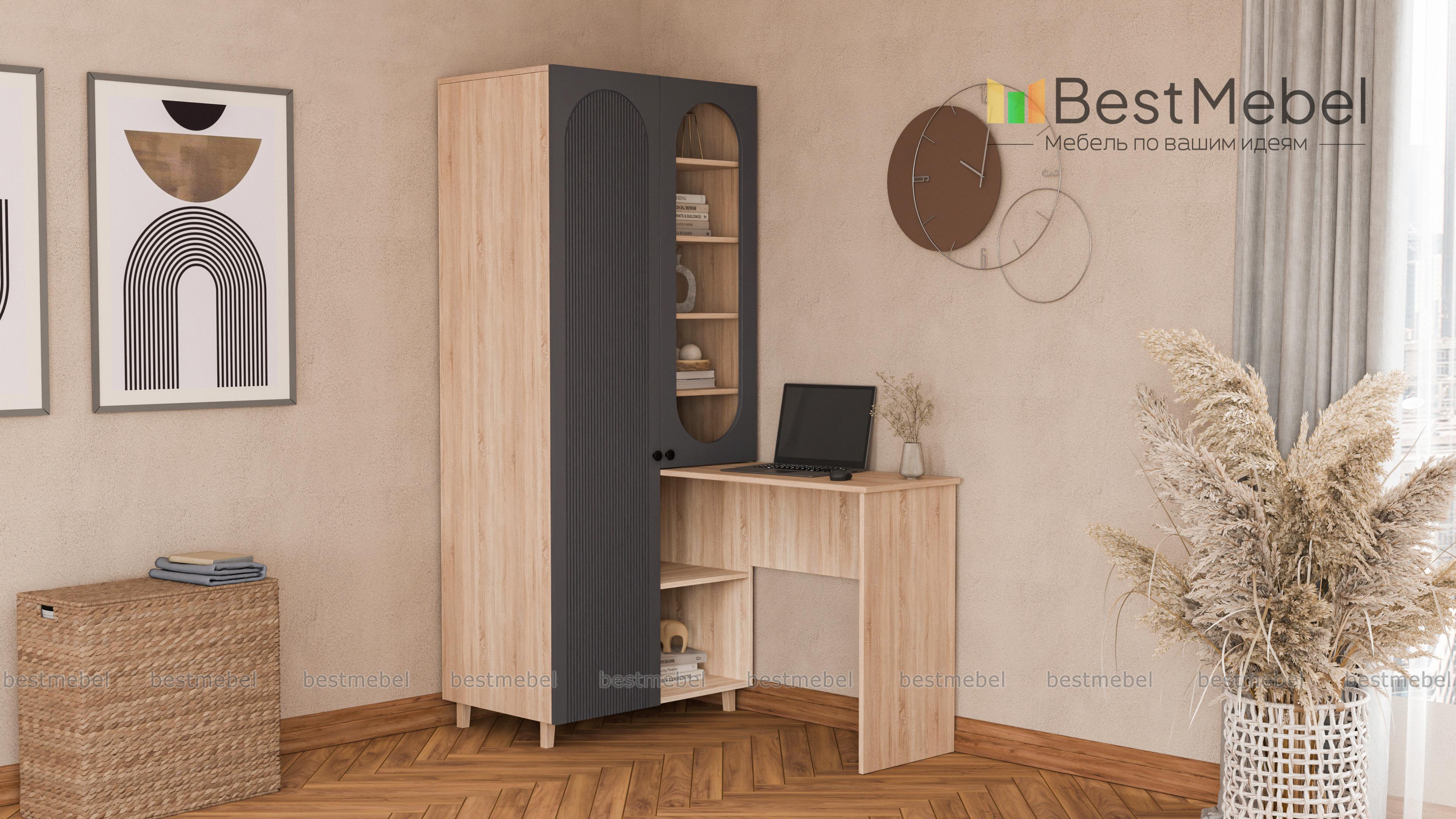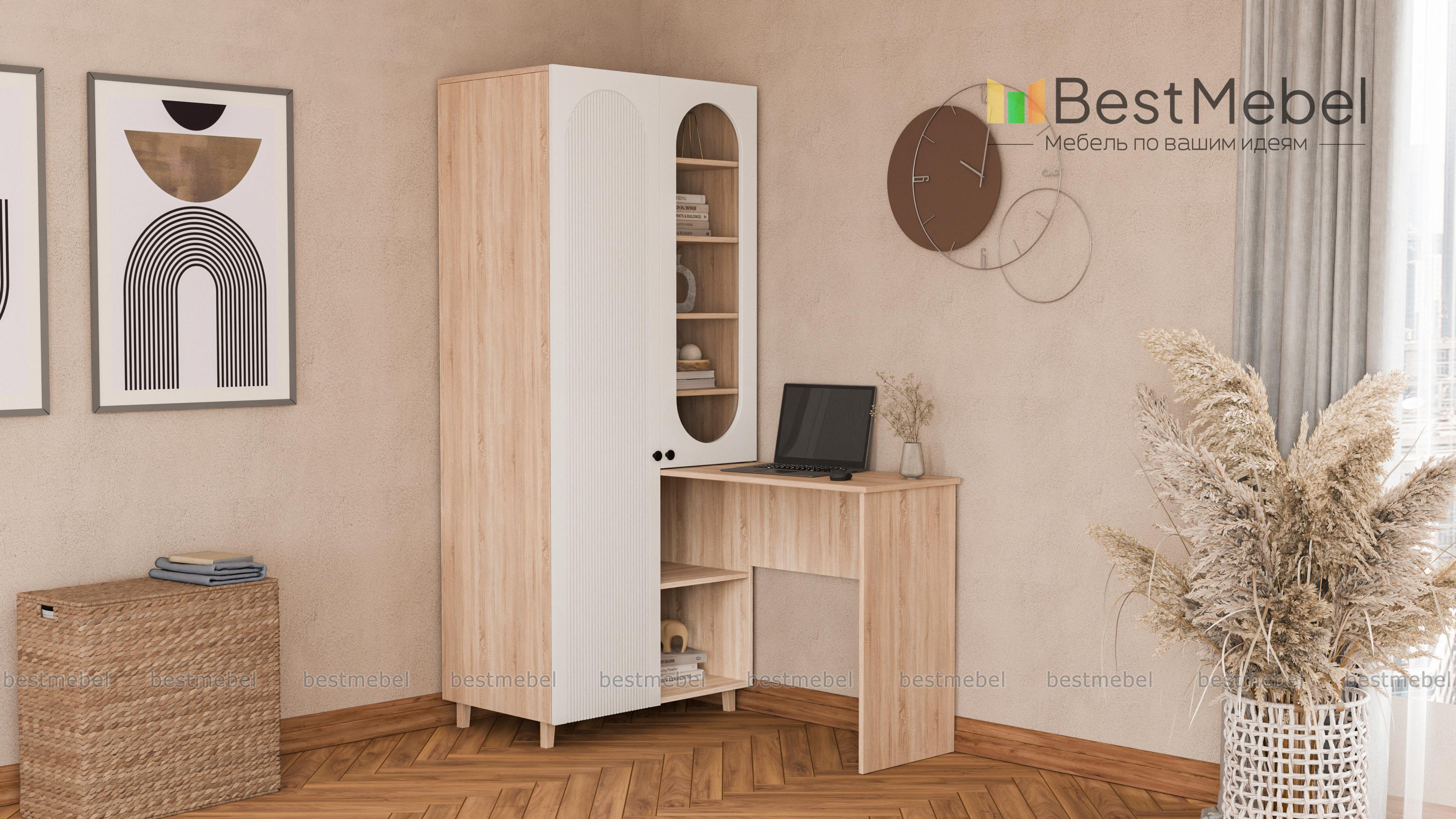 Шкаф со столом Рене 4 BMS — это многофункциональная современная мебель для детской комнаты или гостиной. Угловая композиция включает в себя распашной шкаф, оснащенный закрытым отделением для одежды, полками и витриной, и письменный стол. Стильные акценты в отделке — овальный вырез витрины и фрезеровка фасада, устойчивость и легкость дарят высокие ножки. Купить шкаф со столом Рене 4 BMS, изготовленный по вашим размерам, приглашаем на сайт нашего интернет-магазина.