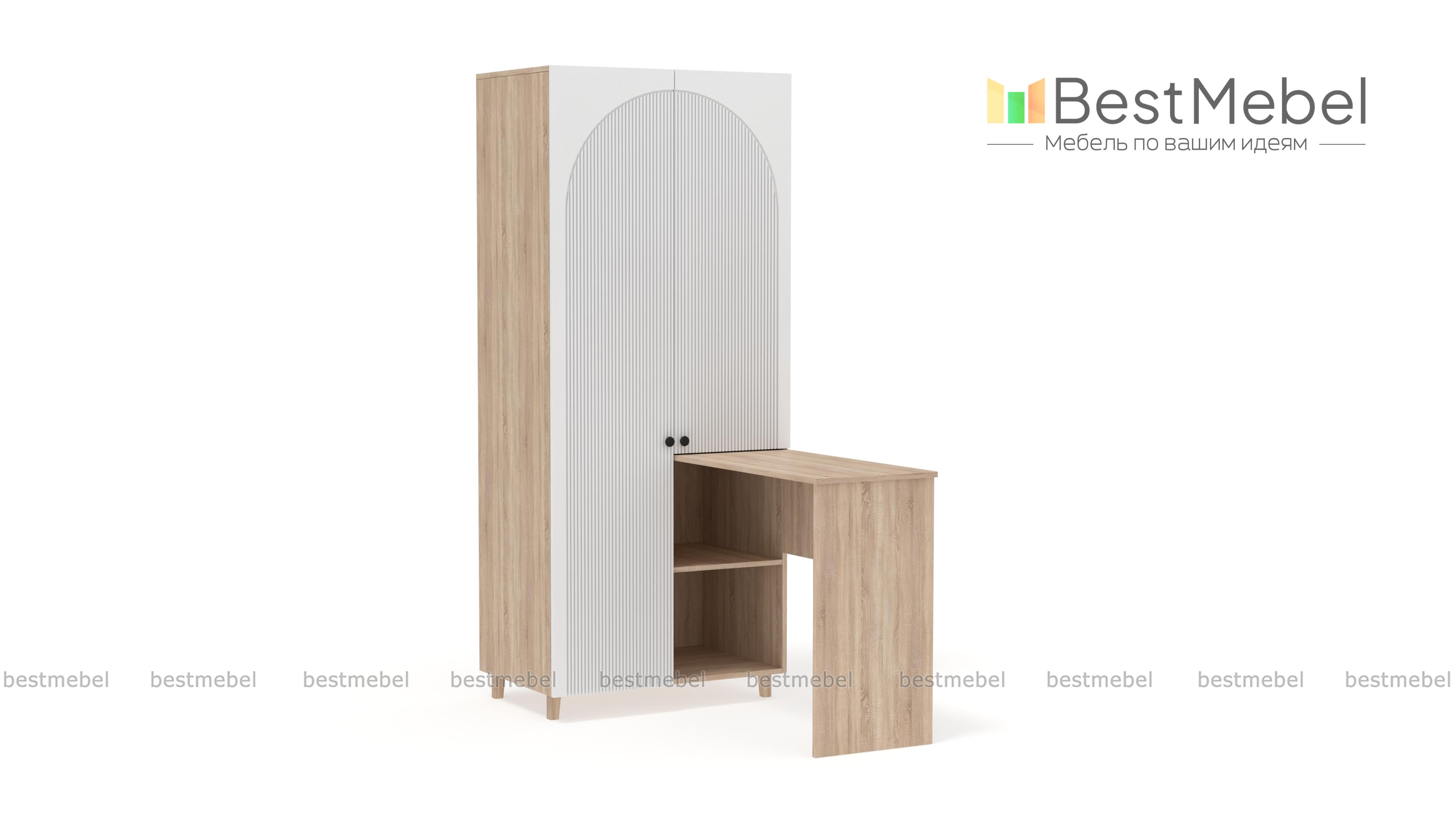 Шкаф со столом Вивьен 3 BMS — функциональная и стильная мебель в небольшую комнату. Угловая конструкция из распашного шкафа с двумя открытыми секциями и письменного столика объединила рабочую зону с удобной системой хранения. Качественные материалы обеспечивают этой модели надежность, а выразительный дизайн создают актуальные оттенки и стильная фактура фасада. Купить шкаф со столом Вивьен 3 BMS, изготовленный по вашим размерам, можно на сайте нашего интернет-магазина.