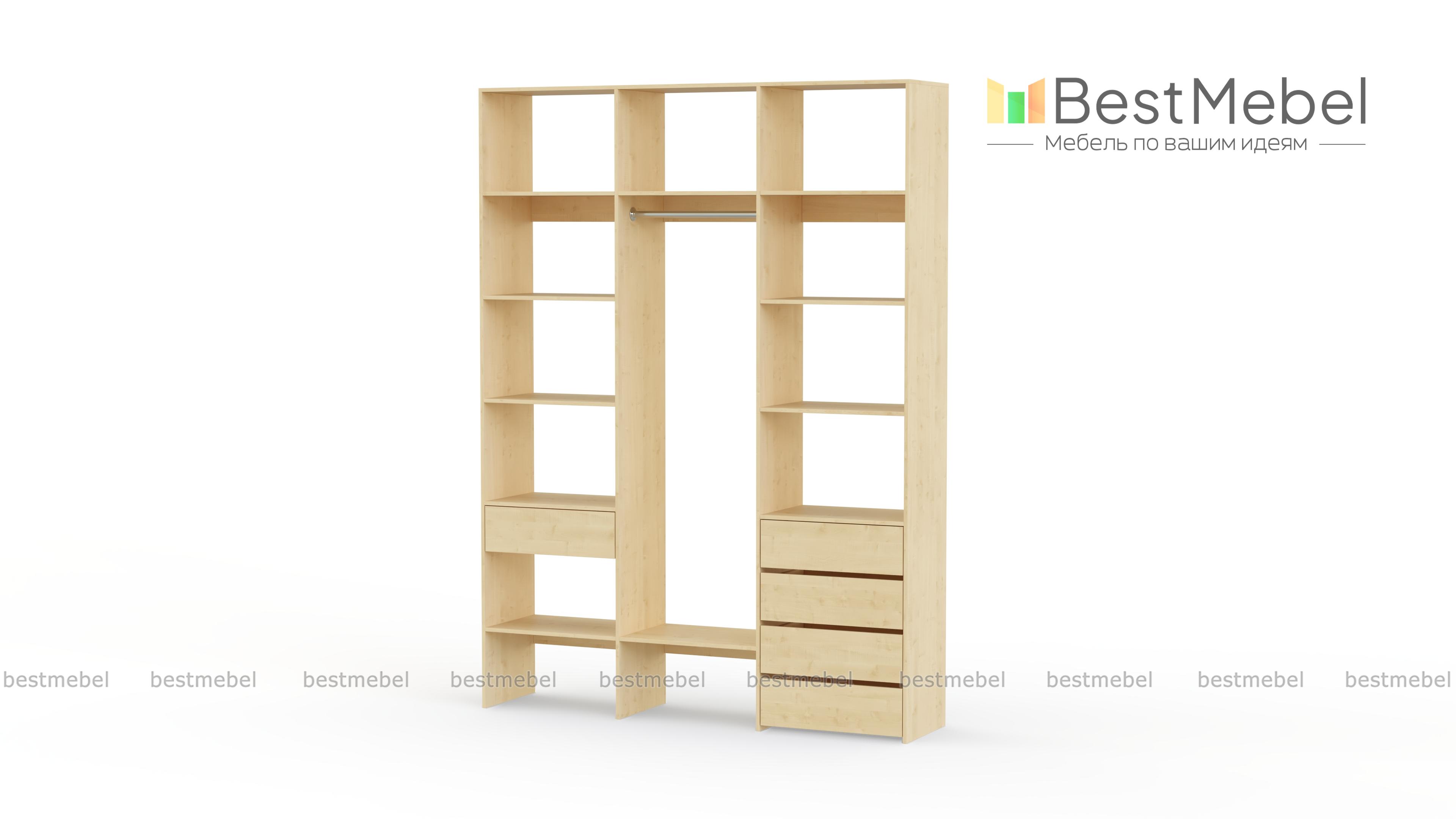 Стеллаж для одежды Мирта 10 BMS поможет легко поддерживать порядок в вашей прихожей, спальне или гардеробной. Все вещи будут на виду и под рукой благодаря продуманной системе открытых полок и выдвижных ящиков с платяной секцией в центре. Стеллаж выполнен из прочной ламинированной плиты, что гарантирует ему долгий срок службы и эстетичный вид. Купить стеллаж для одежды Мирта 10 BMS, изготовленный по индивидуальным размерам, вы сможете недорого в нашем интернет-магазине.