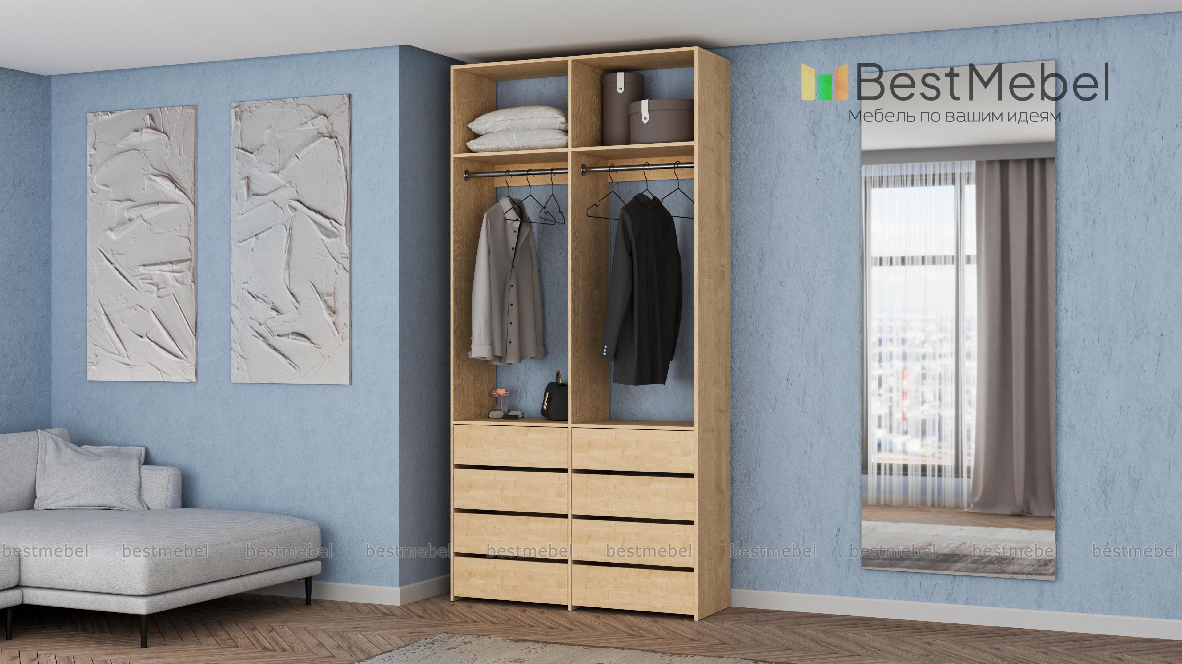 Стеллаж для одежды Мирта 44 BMS — это готовое решение в вашу гардеробную или прихожую. Продуманной системой хранения с двумя штангами, верхними полками и двумя рядами бельевых ящиков удобно пользоваться, не тратя время на поиски нужных вещей. Ламинированное покрытие эстетично выглядит, отличается прочностью и долговечностью. Купить стеллаж для одежды Мирта 44 BMS вы сможете на сайте нашего интернет-магазина с изготовлением по индивидуальным размерам.