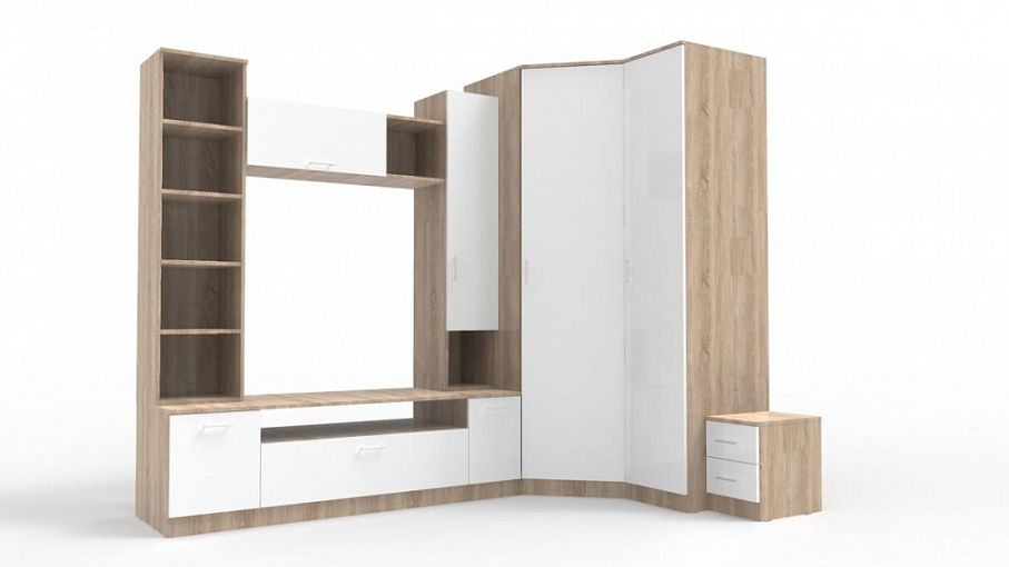 Эта комплектация стенки Софи включает в себя не только угловой элемент из двух компактных одежных шкафов, но и два узких пенала, открытый и с распашной дверью. Тумба под ТВ достаточно широкая даже для модели с большой диагональю. Стенка выполнена в светлых, натуральных тонах с белоснежными глянцевыми фасадами, придающими ей особенно эффектный и универсальный вид. Приобрести модульный комплект Софи Композиция 8 BMS по доступной цене приглашаем к нам в интернет – магазин.