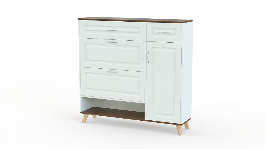 Тумба для обуви Атлант 2 BMS сочетает в себе вместительность и компактные размеры, позволяющие установить ее даже в малогабаритных прихожих. Узкая модель-слим оборудована двумя откидными лотками для обуви, нишей для повседневных пар в основании, распашным отделением под аксессуары и двумя выдвижными ящиками, в которых разместятся необходимые под рукой мелочи. Классические светлые фасады с рамочной фрезеровкой скомбинированы с элементами древесных тонов. Купить тумбу для обуви Атлант 2 BMS вы всегда сможете в нашем интернет-магазине.
