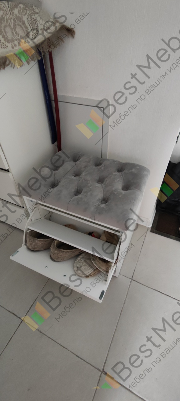 Номер заказа 00000691648 тумба оказалась очень удобной. По моей просьбе её сделали немножко уже, чем было заявлено в стандартных размерах абсолютно бесплатно. Тумба очень надёжная, намного удобнее, чем узкие тумбы. В эту тумбу нормально влезает обувь 43 размера. Ну единственное, что на велюр очень хорошо прилипает кошачья шерсть. Но к когтям устойчиво.