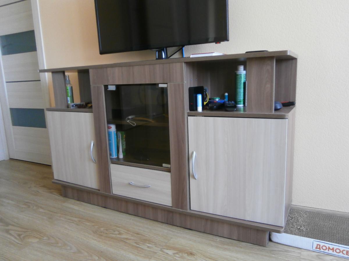 Заказ 00000564751, изделие Тумба под телевизор Виста-11 BMS (1300х750х300)Было необходимо подобрать тумбу под TV по ранее выбранной цветовой гамме мебели и размерам. Оформили заказ в BestMebelShop: тумба под телевизор Виста-11 BMS , габариты 1300х750х300 мм. Это наша вторая покупка в этом интернет-магазине за полгода. Изготовили за 3 дня, доставили в согласованное время — в 23.30. До оплаты курьеру наличными была возможность проверить качество и комплектацию изделия — все ОК. Схема сборки (простенькая) имеется, проблем с самостоятельной сборкой не было. При оформлении заказа выбрали дополнительные опции: ПХВ кромка 2*19 мм, петли с доводчиком, ручки Боярд сатин (металл).Стоимость заказа 9550 руб., с учетом имеющихся у нас бонусов за первую покупку всего к оплате с доставкой вышло 8287 руб. Аналогичные изделия есть в магазинах под заказ, сроки изготовления от 14 до 45 дней, 50% предоплата. Покупкой довольны. На фото две стеклянные дверцы заменены на одно (стекло бронза 360х370 мм) — так удобнее.