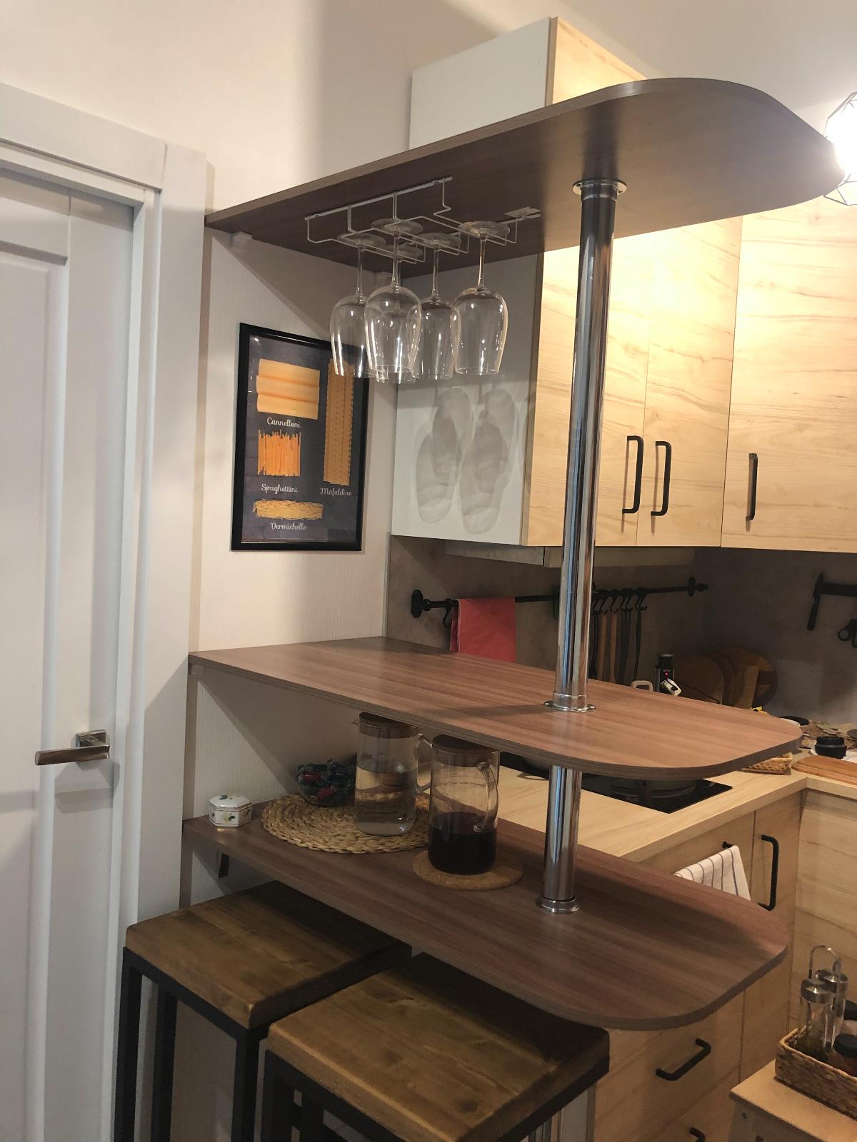 Сделали на заказ под наши размеры. Даже спросили на какой высоте разместить нижнюю и основную столешницы. Муж собирал сам, проблем у него не возникло. В комплекте были все необходимые детали! Спасибо.