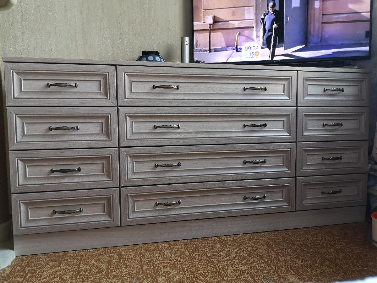 Давно хотела новый комод, взамен старого и тумбочки под телевизором, и, что б светлый, и, что б было много ящиков. Почти год на него смотрела, он успел подорожать! Заказала, поменяла только цвет, не смогла выбрать светлые ручки на сайте, думала куплю сама и заменю, но оказалось, что эти его не портят! Мне нравится! А собирать его лучше мастера приглашать всё таки 12 ящиков! Расстояния между которыми по горизонтали и по вертикали должно быть одинаковым.