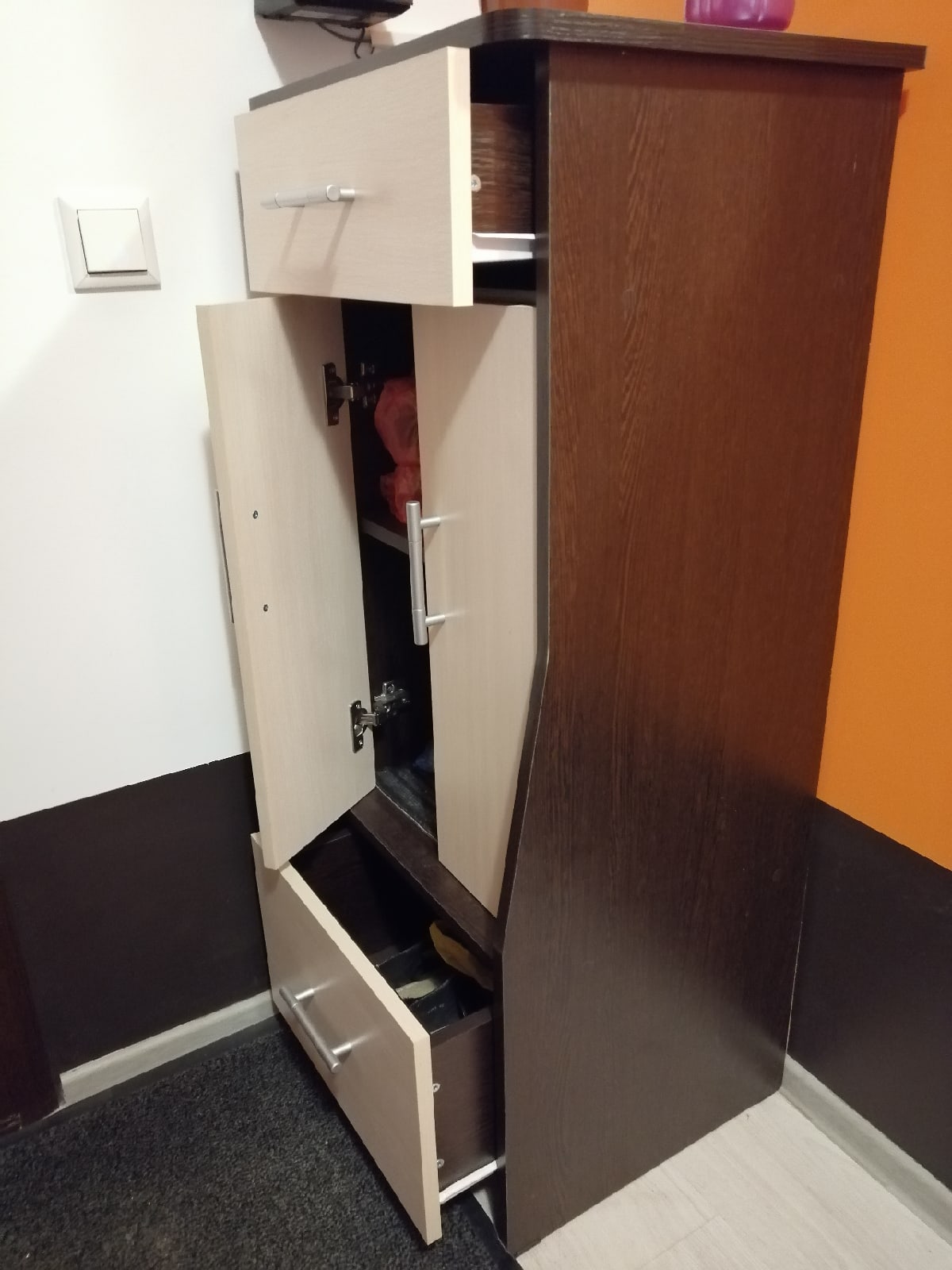 Высокая, вместительная тумба. Комплектацию покупал самую простую. В целом доволен. Есть два типа полок: верхний и нижний ящик, посередине распашная больная полка. Достаточно удобно. Плюс сверху удобно класть мелочи, что должно быть под рукой. За свои деньги очень удобная конструкция. Места занимает мало, хоть и кажется первое время отдельным шкафом, но на самом деле функциональная и удобная тумба.