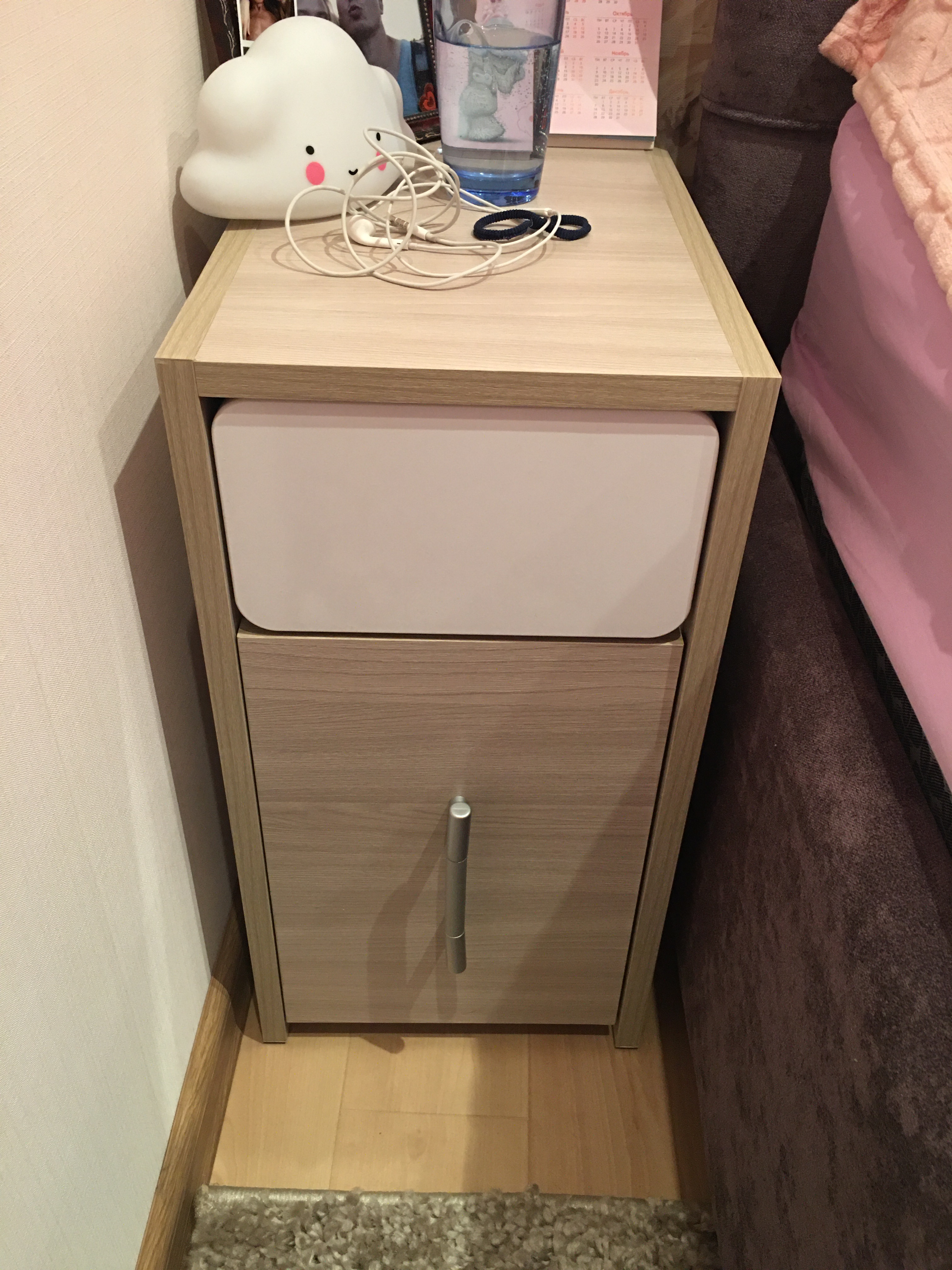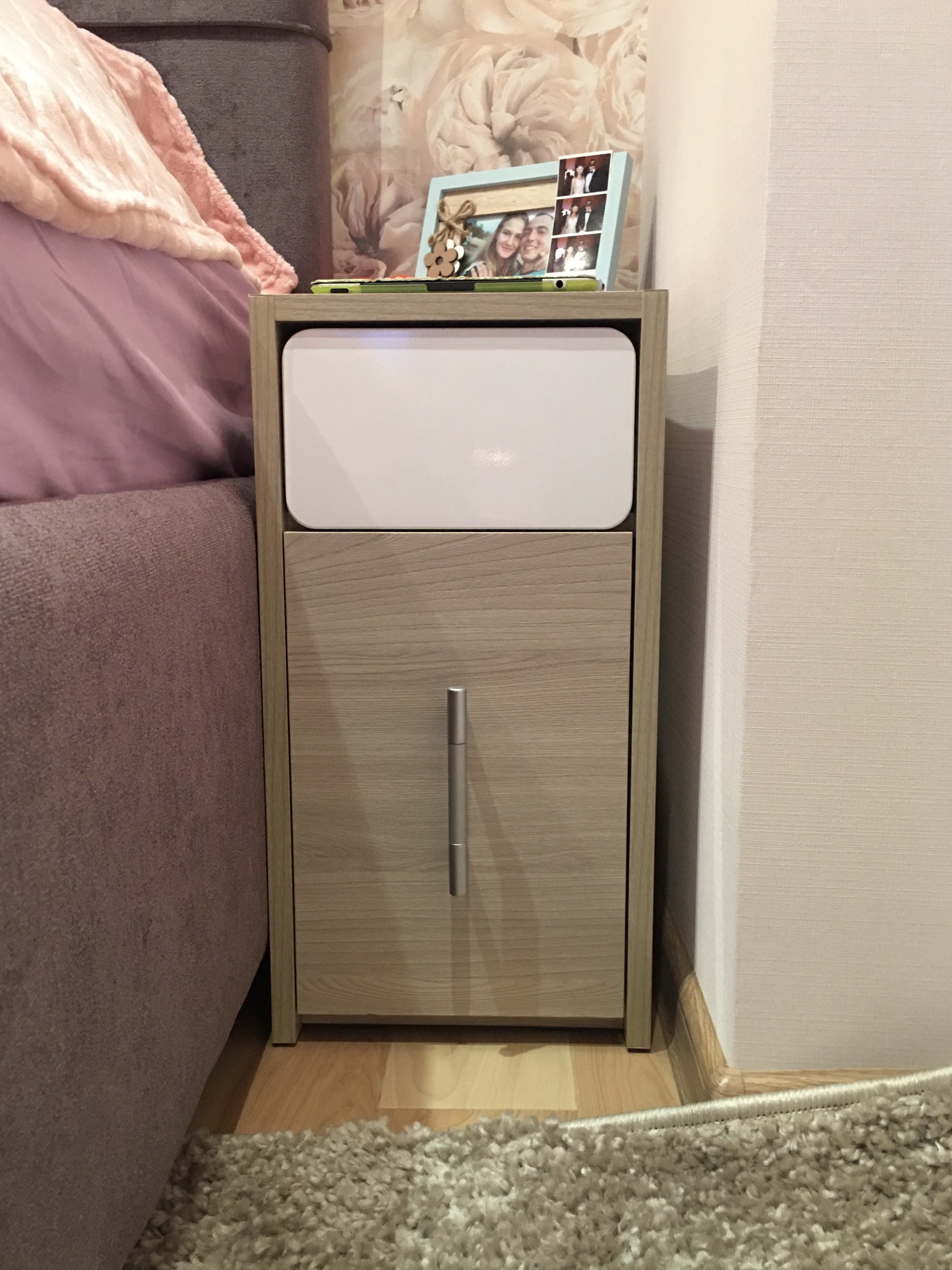 Тумбочки очень классные! Огромный плюс, что на сайте можно выбрать собственные размеры! Думала такого не найду или будет ну очень дорого, а здесь просто супер и цена, и качество, и это как раз то, что я хотела) дело в том, у нас в квартире отдельная ниша под кровать, а кровать занимает почти все место (остаётся в сумме 59 см), а хотя бы маленькие прикроватные тумбочки все равно хотелось! И вот эти две идеальные тумбочки чудесно вписались в наш интерьер! Я выбрала для них меленькую ширину - всего 26 см, длину - 40 см и высоту 50 см (стандартные) и они получились миниатюрными и очень аккуратными и чудесно вписались! На них отлично влезает все самое необходимое, верхний ящик - выдвижной, открывается нажатием, нижний распашной с одной полкой внутри!Я сделала заказ на сайте в понедельник, срок изготовления составлял 5-7 рабочих дней! И сразу после заказа мне позвонили и назначили срок доставки на пятницу! Я была удивлена такой скоростью и сначала даже не поверила, так как пройдя через весь ремонт и кучу доставок и задержек сроков уже не верила, что существует такая скорость! Но все оказалось правдой! И тумбочки уже были у меня дома вечером в пятницу, а в субботу мы их собрали! Ещё и доставка была бесплатной!!Качество материала хорошее, их было легко собирать, в комплекте была вся необходимая для сборки фурнитура! В общем всем рекомендую магазин и производителя! Огромное спасибо за качество и такое хорошее отношение к клиентам! Я очень рада:)