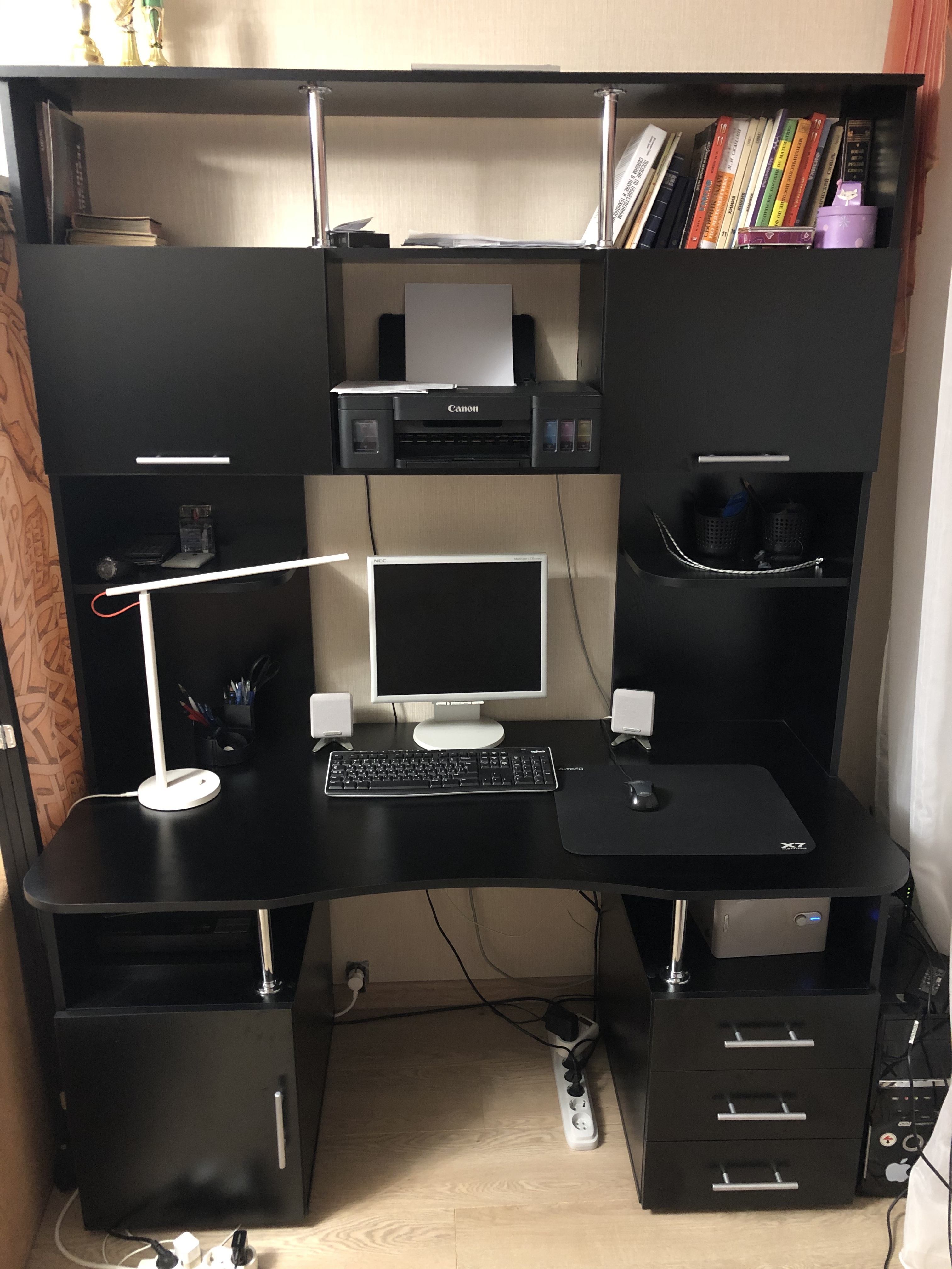 Пользуюсь столом уже пару месяцев. Стол удобный, большой и вместительный. Поместились даже громоздкие принтер со сканером. Сборка не самая простая, пришлось вызывать мастера.Качество стола отличное, магазин принял заказ оперативно.